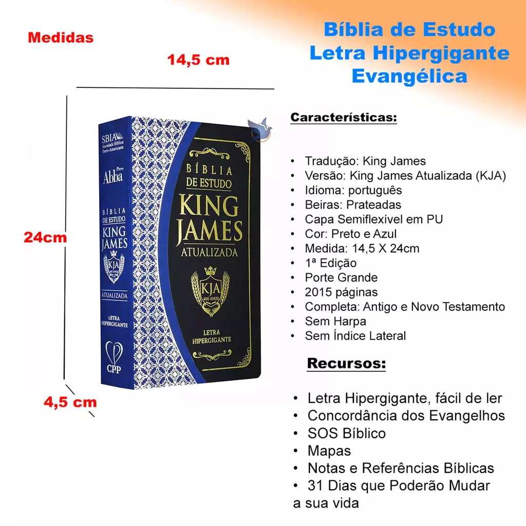 Bíblia de Estudo na tradução King James, versão King James Atualizada (KJA), Edição Original de Estudo 400 anos. Capa Semiflexível em material PU, modelo bicolor Preto e Azul. Porte grande, com 2015 páginas. Com Letra Hipergigante, um tamanho de fonte ampliado que torna a leitura mais fácil e confortável.
