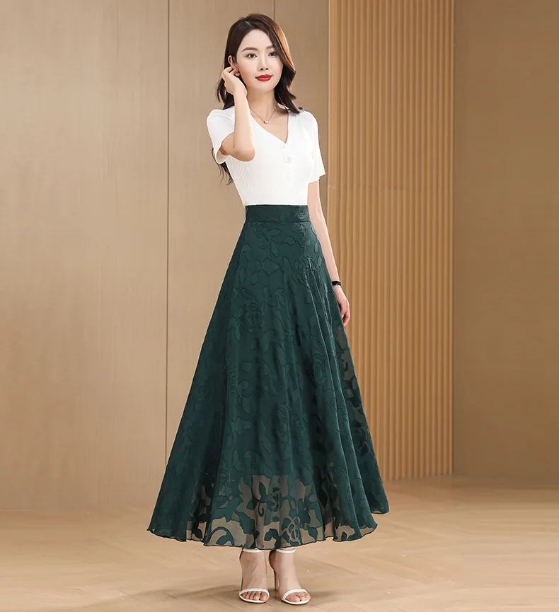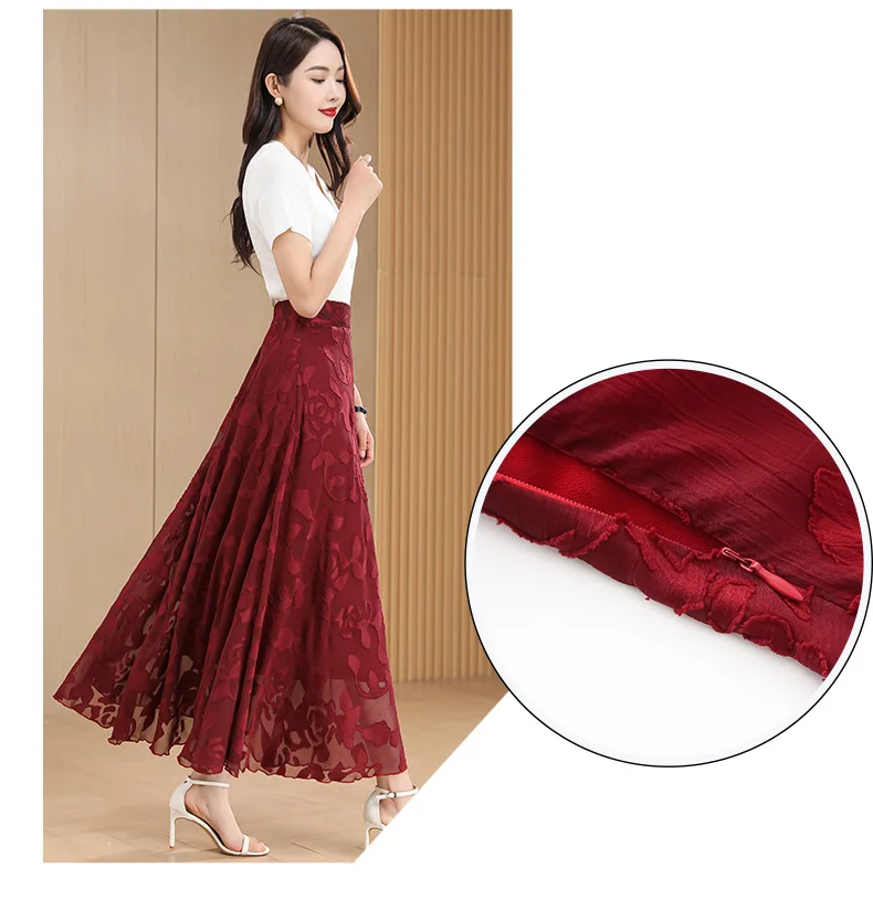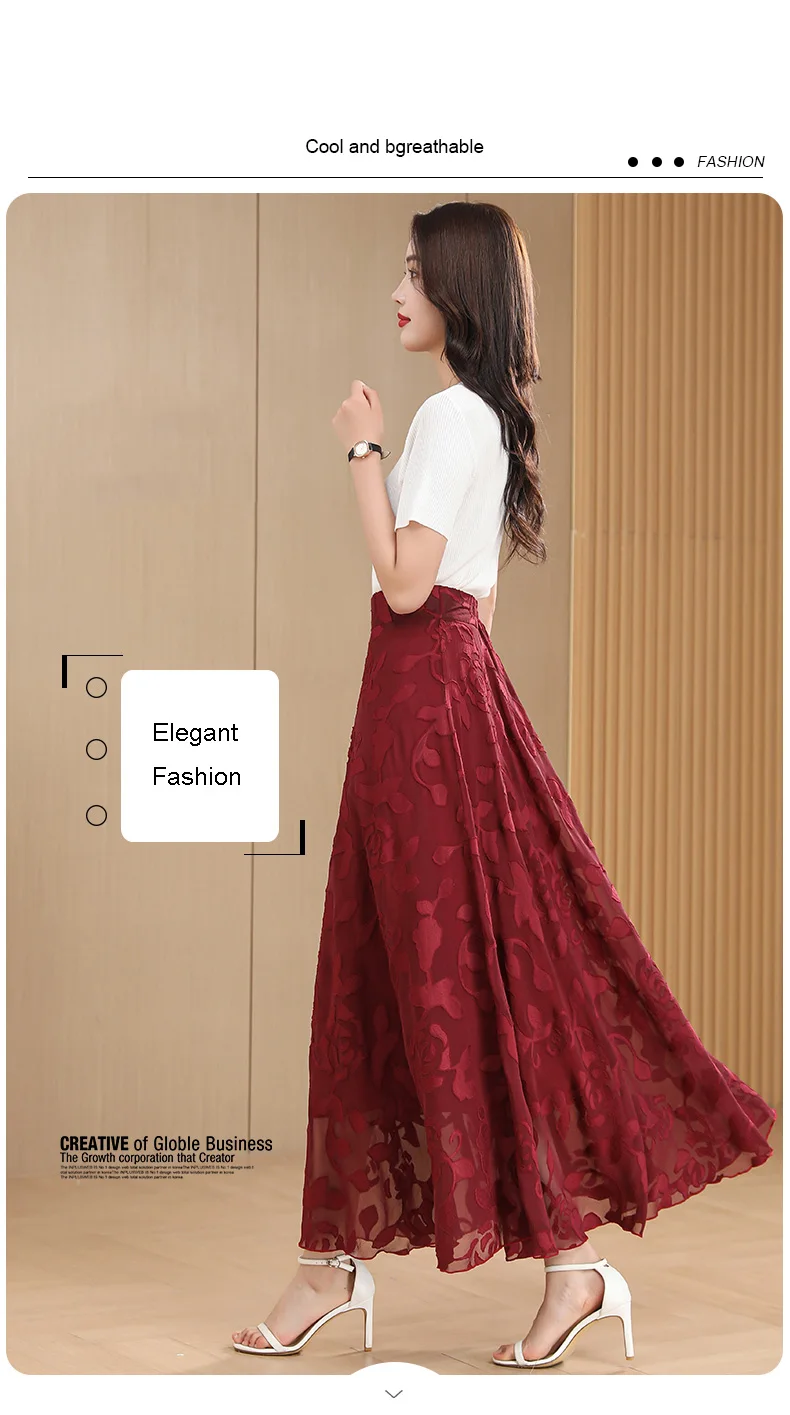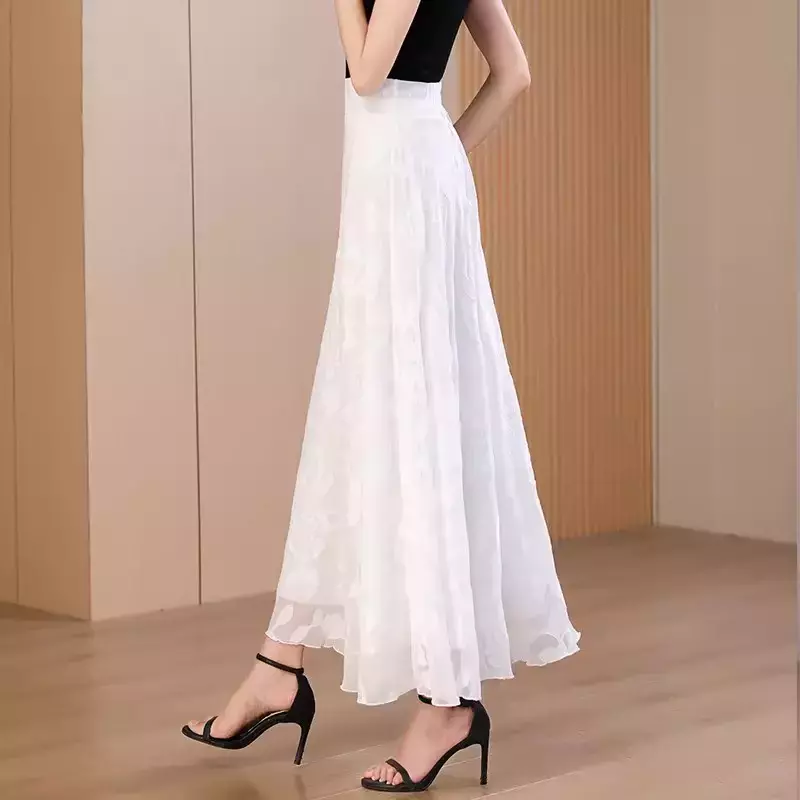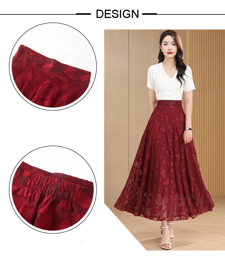 Feita para mulheres que prezam por elegância, conforto e versatilidade, esta saia combina um design moderno com o charme atemporal do corte A-line, conhecido por valorizar todos os tipos de corpo. A cintura alta modela a silhueta, alonga a figura e garante um caimento impecável, enquanto o tecido de chiffon leve e fresco traz a sofisticação do jacquard com um toque suave e fluido — perfeito para os dias quentes de verão ou até para ocasiões especiais.