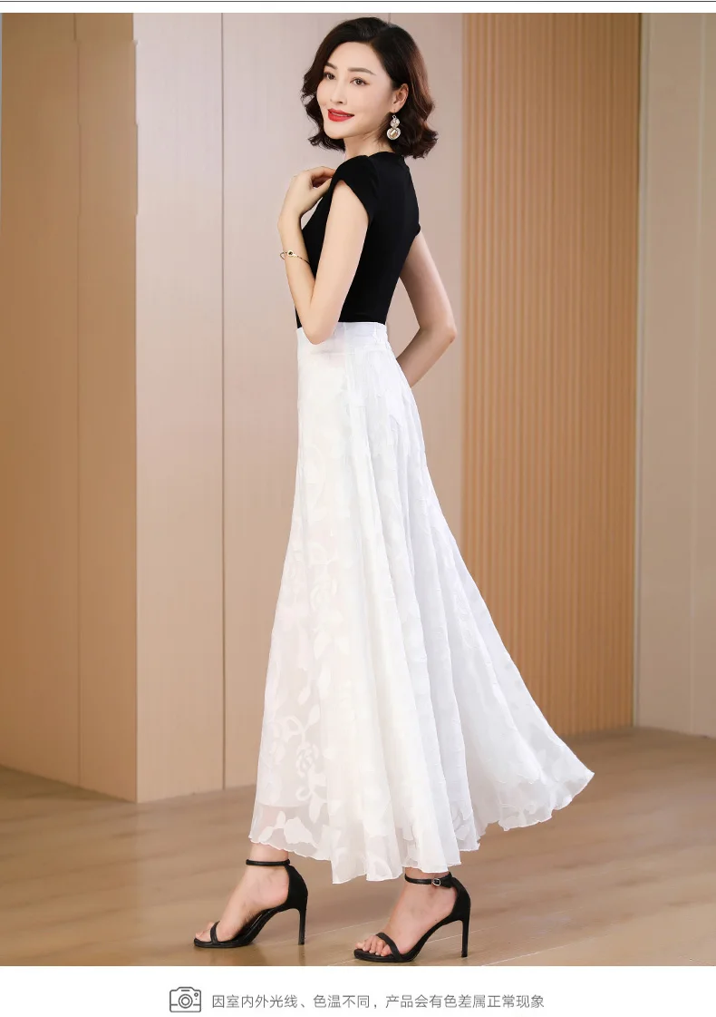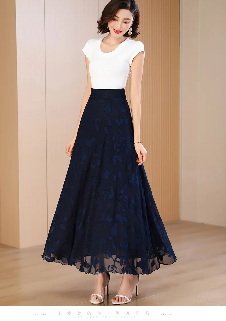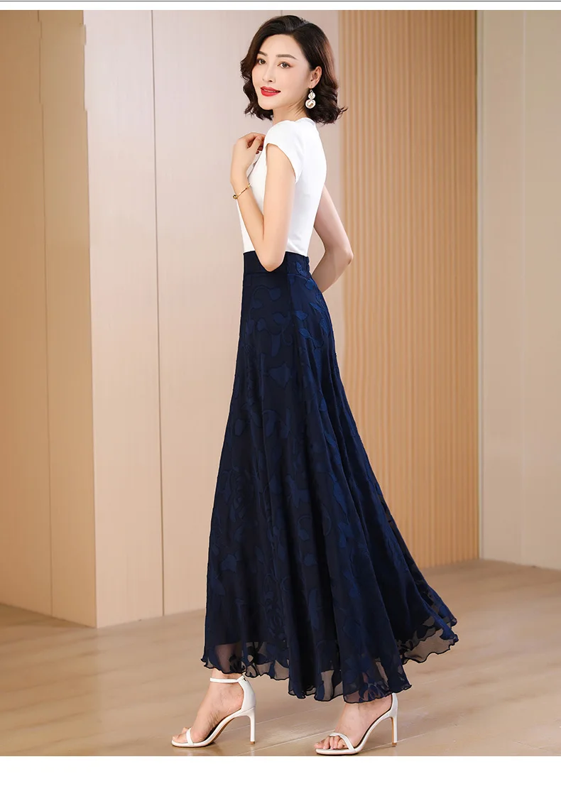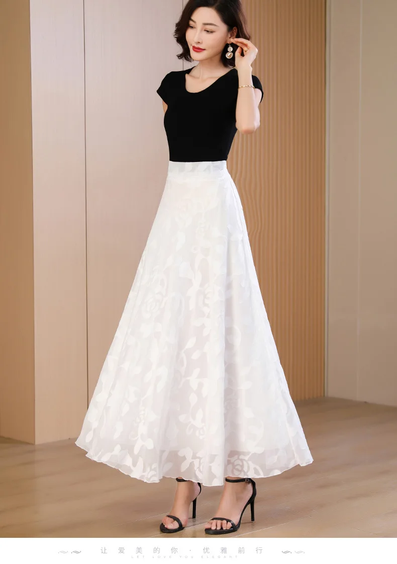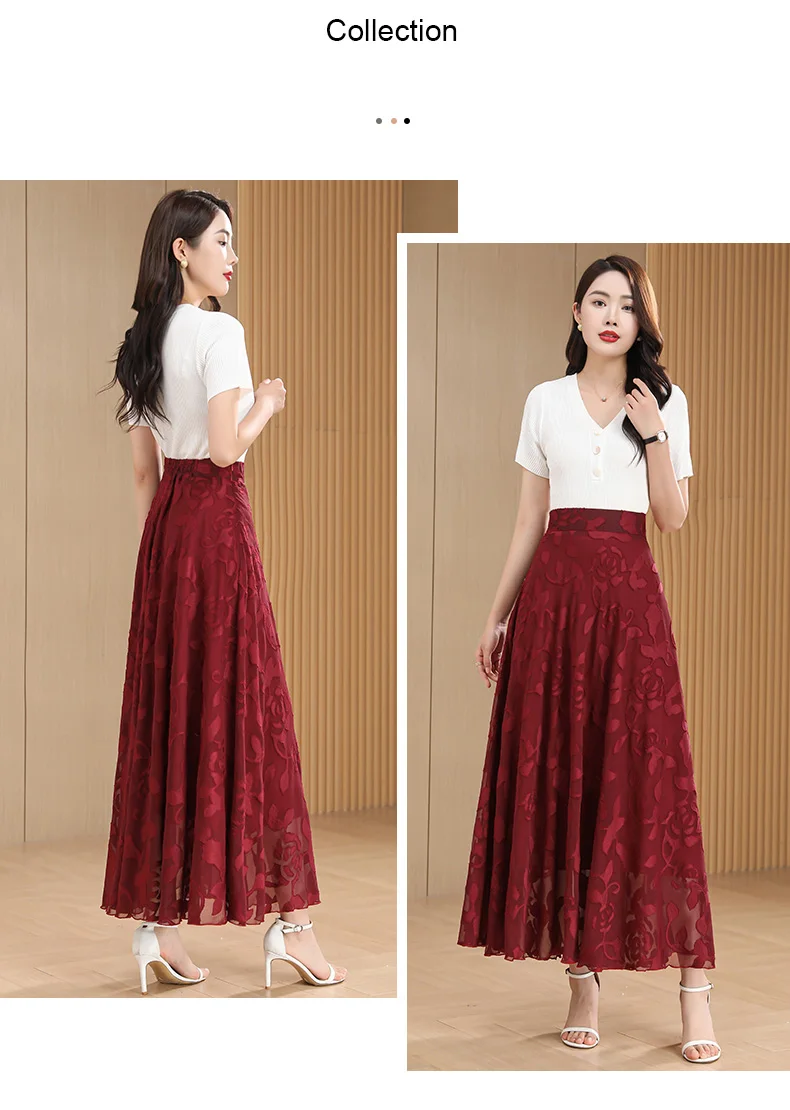 Feita para mulheres que prezam por elegância, conforto e versatilidade, esta saia combina um design moderno com o charme atemporal do corte A-line, conhecido por valorizar todos os tipos de corpo. A cintura alta modela a silhueta, alonga a figura e garante um caimento impecável, enquanto o tecido de chiffon leve e fresco traz a sofisticação do jacquard com um toque suave e fluido — perfeito para os dias quentes de verão ou até para ocasiões especiais.